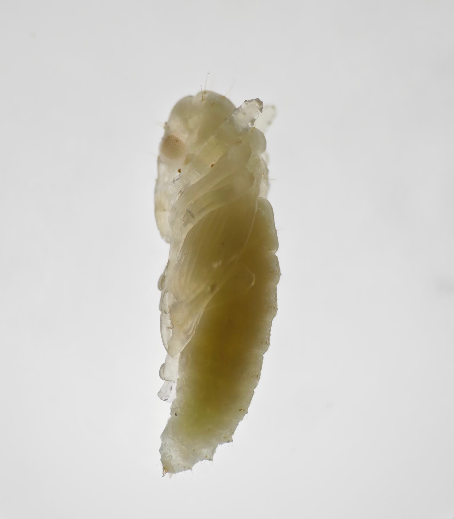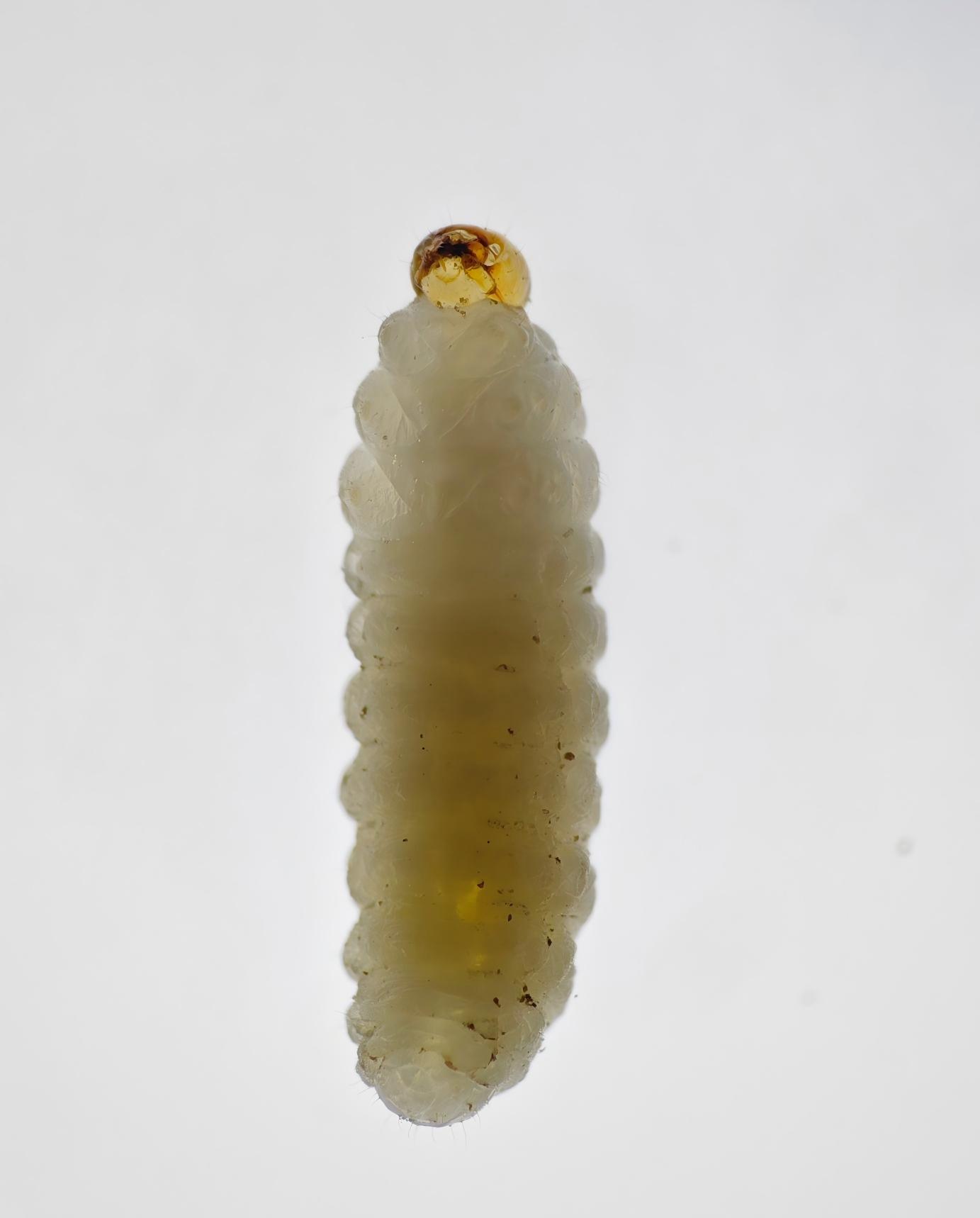 幼虫:末龄幼虫体长5.0~8.5 mm,头部浅褐色,呈圆筒形,两端略小,略弯向腹侧,胸部、腹部乳白色有稀疏白细毛,胸足退化,幼虫共5龄。